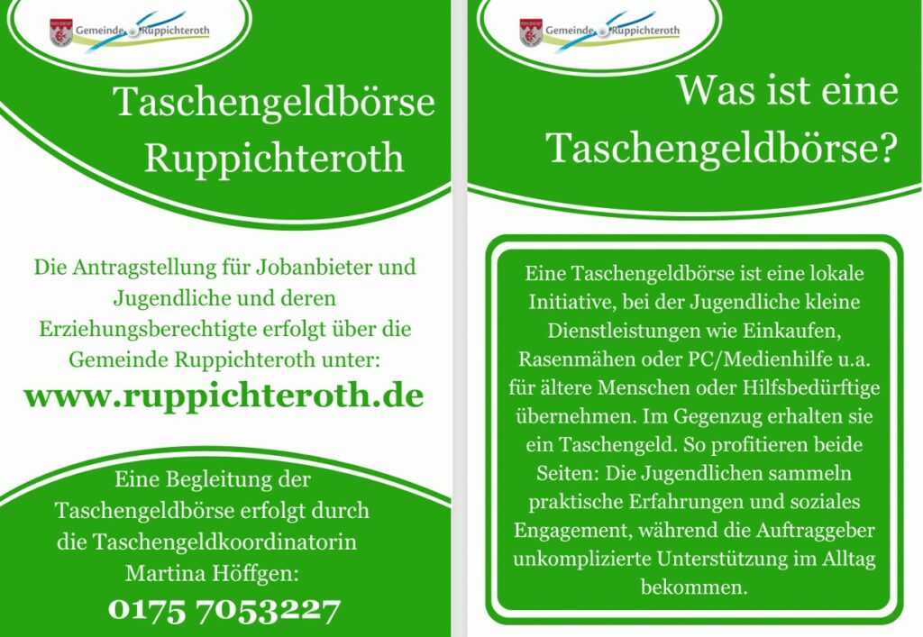 | Taschengeldbörse (Initiative des Arbeitskreises Senioren und Menschen mit Behinderung der Gemeinde Ruppichteroth) | Finanzierung der anfallenden Kosten für Koordination und Kommunikation | März 2026 | Info´s über die Taschengeldbörse: siehe unten oder über nachfolgenden Link https://www.ruppichteroth.de/leben-in-der-gemeinde/taschengeldboerse/ |